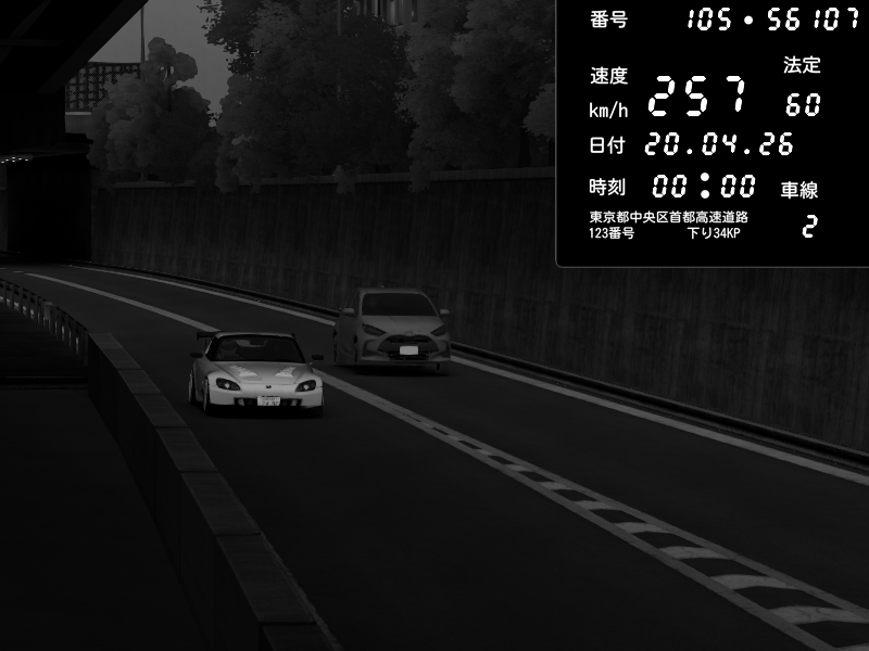 | 2026/04/20 00:00 | C1外回り 京橋 | 257 / 60 km/h | Honda S2000 (AP2 - Legendary) | CAPTURE |