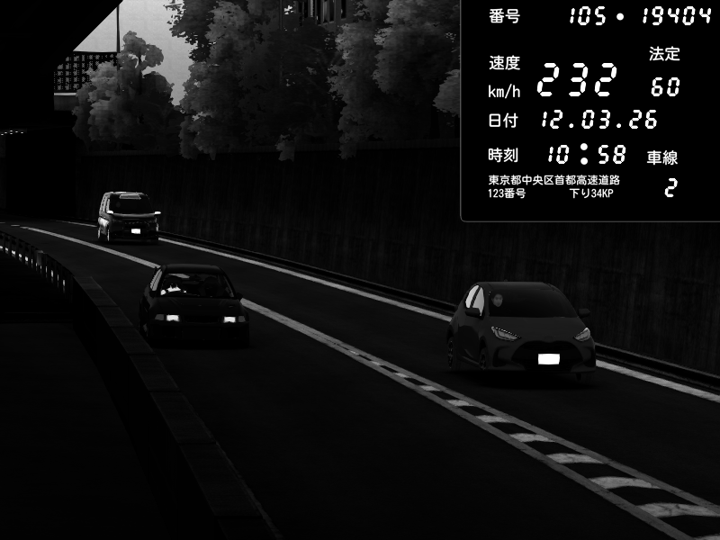 | 2026/03/12 11:03 | C1外回り 新富町 | 141 / 60 km/h | Mitsubishi Lancer Evolution V Wangan Spec | CAPTURE |
