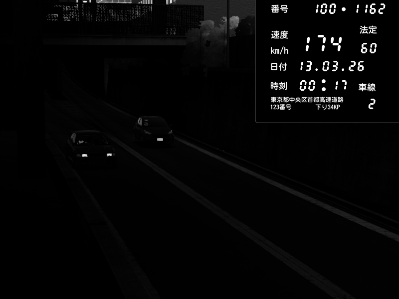 | 2026/03/13 00:17 | C1内回り 京橋 | 174 / 60 km/h | Mitsubishi Lancer Evolution V Wangan Spec | CAPTURE |