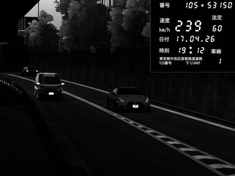 | 2026/04/17 19:12 | C1外回り 京橋 | 239 / 60 km/h | Nissan GT-R NISMO 2017 | CAPTURE |