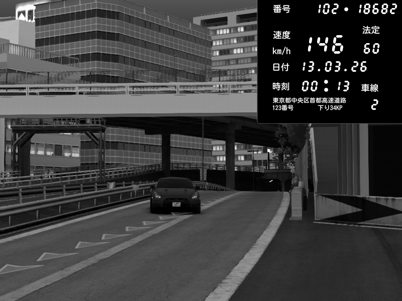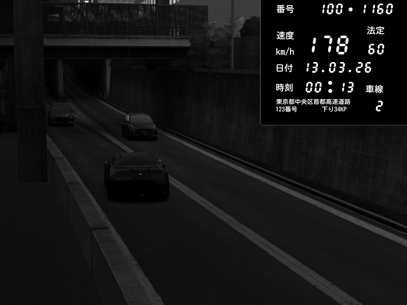 | 2026/03/13 00:13 | C1内回り 京橋 | 178 / 60 km/h | Nissan GT-R NISMO 2017 | CAPTURE |