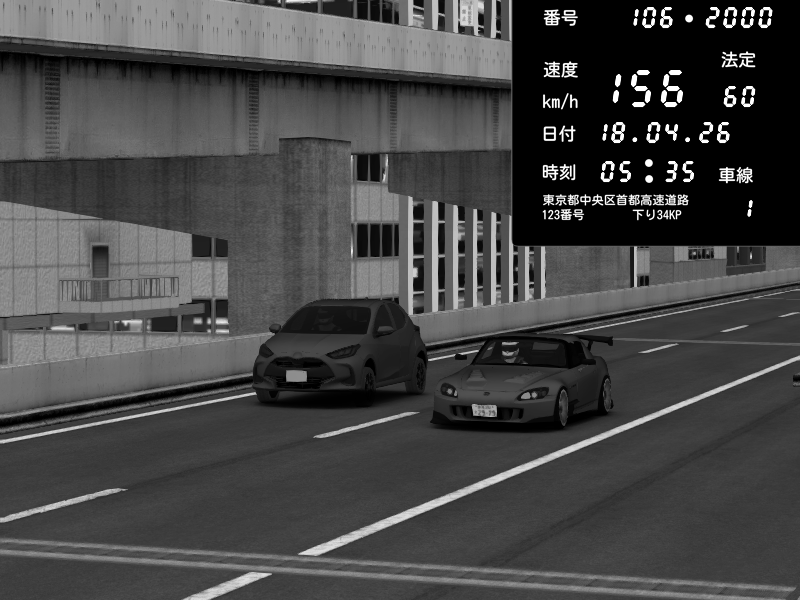 | 2026/04/18 05:13 | C1内回り 竹橋JCT | 101 / 60 km/h | Honda S2000 (AP2 - Legendary) | CAPTURE |