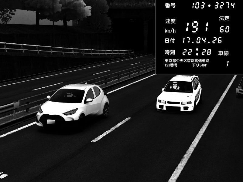 | 2026/04/17 22:30 | C1外回り 芝公園 | 227 / 60 km/h | Mitsubishi Lancer Evolution V Wangan Spec | CAPTURE |