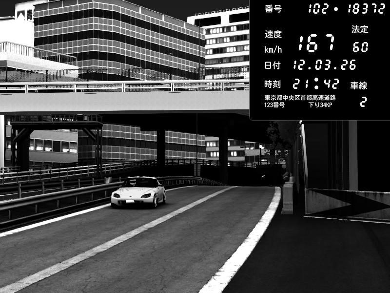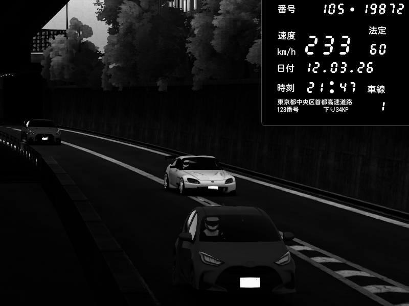 | 2026/03/12 21:47 | C1外回り 京橋 | 233 / 60 km/h | Honda S2000 (AP2 - Legendary) | CAPTURE |