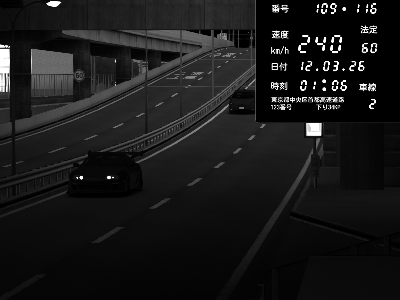 | 2026/03/08 00:35 | K1上り 子安 | 232 / 60 km/h | Player | Mitsubishi Lancer Evolution V Wangan Spec | CAPTURE |